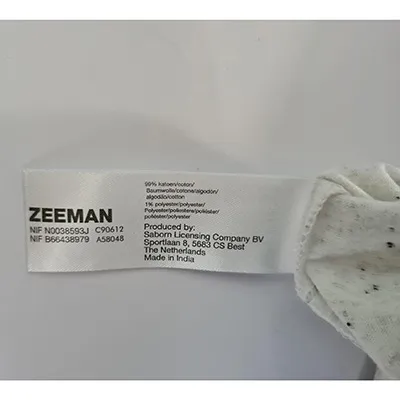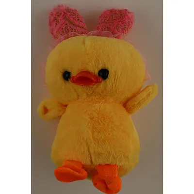 Jucărie de pluș, în formă de rață galbenă, cu urechi roz de iepure, picioare portocalii, ochi negri de plastic și un cioc portocaliu de plastic. O buclă albă este atașată la capul jucăriei.
