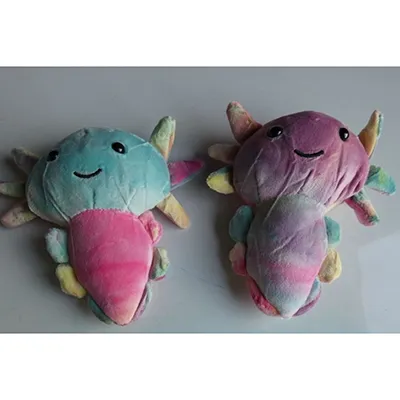 Jucărie moale sub formă de axolotl, cu ochi negri din plastic. Produs vândut online, în special prin intermediul TikTok.