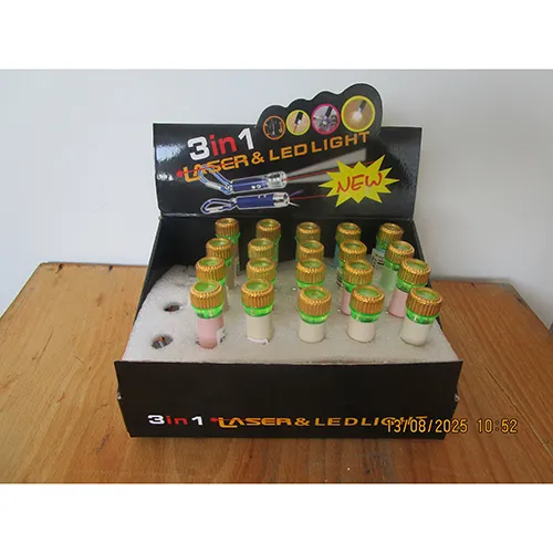 Indicator laser cu lumină intermitentă LED și un suport pentru lanț de chei în mai multe culori. Produsul are două butoane de operare și este alimentat de baterii de celule.
