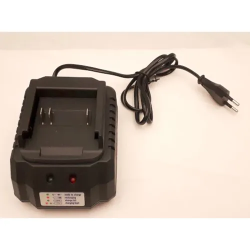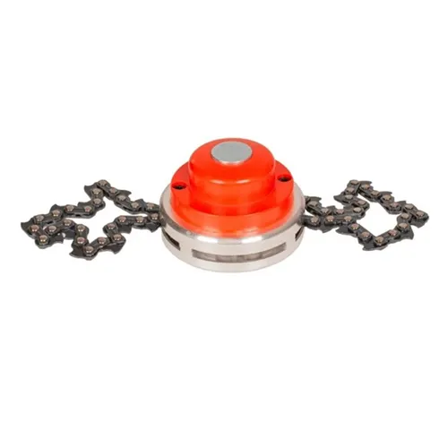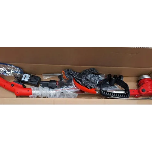 O mașină de tuns iarba de mână mică, roșie și neagră, cu baterii litiu-ion reîncărcabile. Produs furnizat cu mănuși și ochelari de protecție.