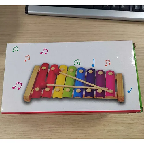 Xilofon din lemn și metal multicolor, cu 2 ciocane. Produs vândut online, în special prin intermediul royaumemontessori.fr.