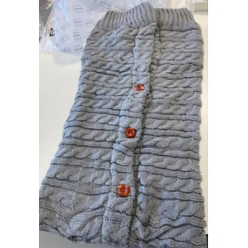 Sac de dormit gri tricotat cu nasturi maro.